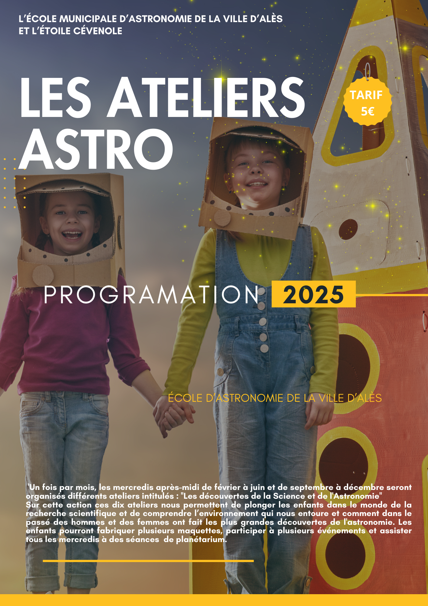 Adossée à l’Ecole Municipale d’Astronomie d’Alès et située au Pôle Culturel et Scientifique de la Ville d’Alès, l’association développe des actions dans le domaine du loisir scientifique, de l’éducation, de la culture et de l’enrichissement de son propre savoir. Nous avons pour vocation d’intervenir auprès de tous publics pour animer des soirées d’observation, des séances d’information, des débats, des conférences,… L’association peut, en particulier, intervenir dans des établissements recevant un public scolaire (centre aérés, colonies de vacances, écoles, collèges, …) afin de mettre en place divers action pédagogiques (projets interdisciplinaires, séances de sensibilisation, d’information, d’observation…)